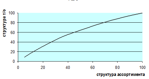 График строим по параметрам – доля позиции в объеме реализации нарастающим итогом и структура ассортимента (рисунок 11):