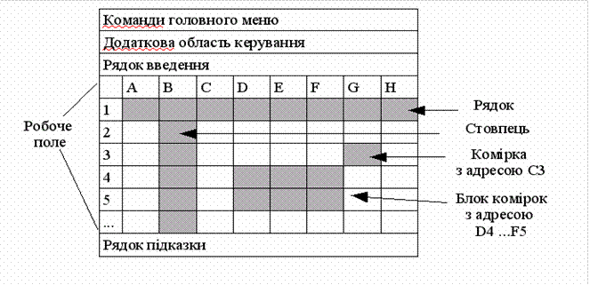 - економічні розрахунки - інженерні задачі - статистична обробка даних - пошук оптимальних значень параметрів - побудова графічних залежностей і діаграм - однотипні розрахунки над більшими наборами даних - моделювання складних фінансових ситуацій, бухгалтерські розрахунки - обробка результатів експерименту Спеціальні засоби дозволяють автоматично отримувати і роздруковувати налагоджувані звіти з використанням десятків різних типів таблиць, графіків, діаграм, додавати до них коментарі і графічні ілюстрації. Табличні процесори мають вбудовану довідкову систему, що надає користувачу інформацію по конкретним командам меню та інші довідкові дані. Багатомірні таблиці дозволяють швидко робити вибірки у базі даних по будь-якому критерію. Основні можливості: бази даних, діаграми, друк, макроси, розрахунки. Об'єкти електронної таблиці - рядки, пронумеровані арабськими цифрами - комірка – первинний елемент таблиці, що містить дані, кожна комірка позначається адресою, яка складається з номеру рядка і імені стовпця - стовпці, що йменуються латинськими літерами A, B,... Z, AA, AB,... AZ Робоче поле електронної таблиці складається із рядків і стовпців. Адреса комірки ще називається посиланням. Крім адреси, комірка може мати власне ім'я, яке може використовуватися у формулах. Поточна комірка позначена вказівником – прямокутником, що світиться. Типовий інтерфейс електронних таблиць. Форматування даних. Формули та функції. Усі відомі табличні процесори мають типову структуру інтерфейсу. При роботі з електронною таблицею на екран виводяться робоче поле таблиці і панель керування, яка включає: Головне меню, допоміжну область керування, рядок вводу в рядок підказки. Розташування цих областей на екрані може бути мимовільним і залежить від особливостей конкретного табличного процесора. Рядок головного меню містить імена меню основних режимів програми. Вибравши один з них, користувач отримує доступ до меню, що містить перелік команд, які в нього входять. Після вибору деяких команд меню з'являються додаткові підменю.
