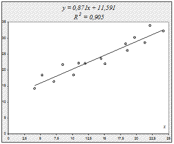 следовательно, гипотеза H0 отвергается, принимается альтернативная гипотеза H1: с вероятностью 1-α =0, 95 полученное уравнение статистически значимо, связь между переменными x и y неслучайна. Построим полученное уравнение.