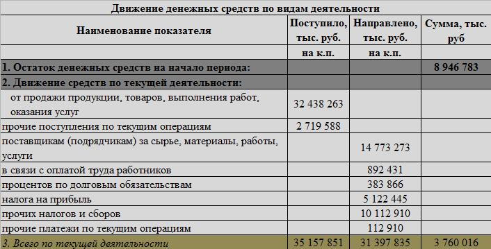 С помощь анализа движения денежных средств по видам деятельности можно увидеть, по какому виду деятельности было поступление денежных средств, и по какому виду деятельности оно был отток. Также в таблице можно рассчитать сальдо на начало и конец периода.