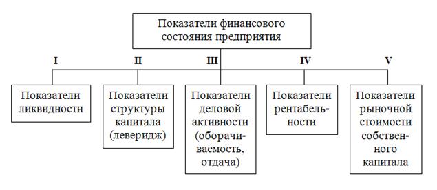 Целью экспресс-анализа является простая оценка финансового состояния и динамики развития предприятия. Обычно экспресс-анализ проводится в следующей последовательности: 1. Анализ изменения валюты баланса в сопоставимых ценах. Как правило, сокращение валюты баланса - неблагоприятный симптом. 2. Анализ «больных» статей: - убытки отчетного года и прошлых лет; - долгосрочные кредиты и займы, не погашенные в срок; - краткосрочные кредиты и займы, не погашенные в срок. В рамках экспресс-анализа изучают статьи, характеризующие дебиторскую и кредиторскую задолженности. Негативным обстоятельством являются любые резкие изменения в этих статьях. 3. Сравнительный анализ динамики итога баланса, объема реализации (выручки) и прибыли предприятия. Динамично развивающееся предприятие характеризуется более высокими темпами роста прибыли по отношению к выручке, а выручки – по отношению к валюте баланса. 4. Структурный анализ актива и обязательств (пассива) баланса. Негативным моментом является уменьшение доли денежных средств и фиксированных активов при росте доли запасов; а также уменьшение доли источников собственных средств (собственного капитала) при увеличении доли заемного капитала. Основные признаки «хорошего» баланса: ♦ формальными признаками «хорошего» баланса являются рекомендованные ФУДН критерии; ♦ неформальные признаки: - в балансе отсутствуют «больные» статьи; - имеет место рост собственного капитала; - запасы не превышают минимальных источников их формирования (собственные оборотные средства, краткосрочные и долгосрочные кредиты и займы); - дебиторская задолженность находится в равновесии с кредиторской (их отношение ≈ 1); - нет резких изменений в отдельных статьях баланса. 5. Экспресс-диагностика завершается выводами о целесообразности или нецелесообразности более глубокого анализа финансового состояния. Если принято решение о необходимости изучения финансового состояния предприятия, то проводится коэффициентный анализ по следующим группам показателей (рис. 11):