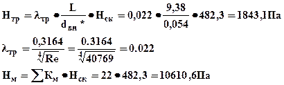 где: Нтр – потери на трение, Па; Нм – местные потери; lтр – коэффициент гидравлического сопротивления, формула Блазиуса – для турбулентного и переходного режимов движения продукта.