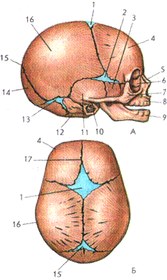 А - вид сбоку, Б – вид сверху; 1 – средний родничок, 2 – клиновидный одничок, 3 – большое крыло клиновидной кости, 4 – лобный бугор, 5 – носовая кость, 6 – слезная кость, 7 – скуловая кость, 8 – верхняя челюсть, 9 – нижняя челюсть, 10 – барабанное кольцо височной кости, 11 – чешуйчатая часть височной кости, 12 – латеральная часть затылочной кости, 13 – сосцевидный родничок, 14 – чешуя затылочной части, 15 – задний родничок, 16 – теменной бугор, 17 – лобный шов