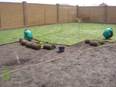 v Укладання газону починають відразу після доставки рулонів. Розкочують смуги готового газону в шаховому порядку, зміщуючи кожен наступний ряд на половину полотна. Краї смуг повинні щільно прилягати одне до одного. Накладення смуг готового газону один на одного або вільний простір між ними неприпустимо.