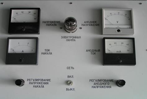 Рис 6. Передняя панель установки На панели расположены: электронная лампа, вольтметры и амперметры анодной и катодной цепей, тумблер «сеть», ручки регулировки источников анодного и катодного напряжений. Источники напряжения размещены внутри блока вместе с соединительными проводами. Внимательно ознакомьтесь с установкой. Перед включением рекомендуется установить ручки регулировки анодного и катодного напряжений в нулевое положение, повернув их против часовой стрелки. Включив установку, снимите и нанесите на миллиметровой бумаге несколько (не менее трех) вольтамперных характеристик диода Ia (Ua)при различных токах накала I н. Для каждой из характеристик определите значения По уравнению (3) рассчитайте температуру катода для каждого тока накала. Постройте на миллиметровой бумаге график зависимости Оцените погрешность полученной величины работы выхода. Данные для расчета: Литература 1. Калашников С.Г. " Электричество". - М.: ФИЗМАТЛИТ, 2003, §§ 156-158 2. Сивухин Д. В. Общий курс физики. Электричество. - М.: ФИЗМАТЛИТ, 2002, § 101