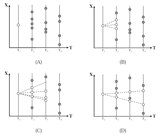 Figure 5: A multiple hypothesis tracker starts from a tentative track (A) and sequentially checks the later time steps. If multiple points fit a candidate track then several hypothesis are created (B) and (C).