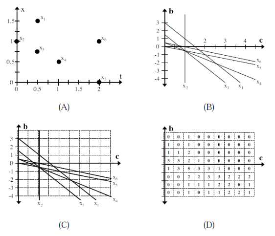 3.2 Parameter Space Methods Another approach to the problem of track initiation is to search for tracks in parameter space. One popular algorithm is the Hough transform [Hough, 1959]. The idea behind these approaches is that for many simple models, individual observations correspond to simple regions or curves in parameter space. An example with a linear model is shown in Figure 8. The points are shown in Figure 8.A and their corresponding lines in parameter space in Figure 8.B. If a series of observations lie along a line, then their lines in parameter space will intersect at a common point. The Hough transform looks for lines by using grid-based counts of the number of lines that go through a particular region of parameter space (Figure 8.C and 8.D). There are several major downsides to the parameter space approach. First, maintaining and querying the parameter space representation can be expensive in terms of both computation and memory. There are many possible intersections to check and storing occurrences in a grid structure may require significant amounts of space. Secondly, the level of discretization of parameter space can drastically affect the accuracy of the algorithm.
