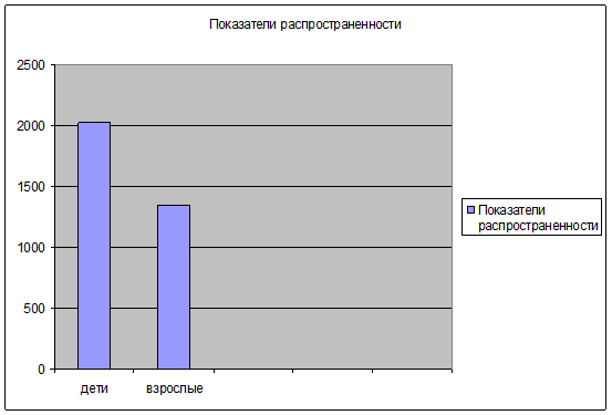 Вывод: показатели распространенности (она же общая заболеваемость – совокупность всех случаев, зарегистрированных обращений населения в амбулаторно-поликлинические учреждения и другие медицинские организации, за год) выше у детей в возрасте от 0 до 18 лет.