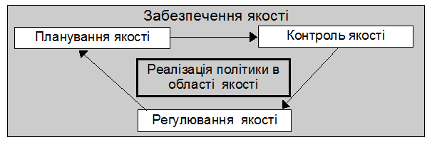 У схемі, поданій на Мал. 11 показано, що між формулюванням політики якості і її реалізацією в рамках системи якості знаходиться комплекс заходів, який називається «забезпечення якості» у рамках системи забезпечення якості. Забезпечення якості містить у собі всі систематизовані і плановані види діяльності, необхідні для виконання установлених вимог. До таких видів діяльності належать планування якості, регулювання якості, контроль якості. Схема забезпечення якості подана на Мал.11.