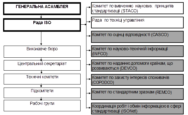 Склад ISO: В даний час членами ISO є 120 країн, а її діяльність пов'язана з 500 міжнародними організаціями. У число нових членів ISO увійшли деякі країни СНД, у тому числі Білорусія, Україна, Туркменістан і Узбекистан. У рамках ISO працює 185 технічних комітетів. Основними органами ISO є Генеральна асамблея, Рада і Виконавче бюро (комітет). На Мал. 14 подано структуру ISO і кольором виділені комітети ISO, у яких Україна представлена Держстандартом.