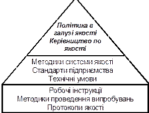 Документація управління якістю підрозділяється на три рівня. До документів першого (вищого) рівня належатья «Керівництво із якості» і «Політика в області якості». У «Керівництві з якості» міститься інформація про систему якості підприємства, ролі і відповідальності персоналу в області забезпечення якості. У цьому документі містяться також методики координації робіт із забезпечення якості. Керівництво видається у вигляді самостійного документа і затверджується на рівні вищого керівництва фірми. «Основним призначенням керівництва з якості є визначення загальної структури системи якості і виконання функції постійного довідкового матеріалу при впровадженні й організації функціонування цієї системи» (ДСТУ ISO 9004-1-95 5.3.). Документація другого рівня - це методики й інструкції, що описують процедури виконання вимог стандартів ISO серії 9000. Вона в основному призначена для керівників середньої ланки. Документація третього рівня призначена для конкретних підрозділів, ділянок, робочих місць. Це - документація методологічного, інструктивного і керівного характеру. Уся документація взаємозалежна і скоординована в керівництві по якості, і спрямована на досягнення цілей, викладених у політиці в галузі якості. Стандарт вимагає встановлення і документального оформлення процедур завердження документації, її випуску і внесення змін. Перегляд, перевірка, затвердження документів завжди повинні проводитися з фіксуванням дії. Це означає, що в будь-який час можна встановити особу, що здійснила перевірку, а також місце і дату підтвердження. Оперативне управління документацією повинно забезпечувати наявність документації на всіх ділянках робіт, вилучення і відповідне позначення застарілої і недійсної документації. Необхідно розробити маркірування (ідентифікацію) документів, систему їхньої реєстрації, збереження й архівування. Варто визначити, хто за що відповідальний, а також місце, де можна знайти документи.
