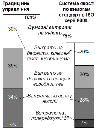Побудова і сертифікація системи управління якістю відповідно до вимог стандартів ISO серії 9000 дозволяє зменшити витрати на якість приблизно на 25-30%. За рахунок цього провідні західні фірми з найвищим вихідним рівнем організації виробництва такі, як SCANIA, VOLVO, PRIPS (Швеція), змогли підвищити прибуток на 10-20 %.