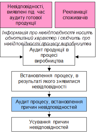 Найчастіше аудит процесу проводиться на найбільш відповідальних ділянках на регулярній основі. Аудит процесу проводять у випадку, коли надходить інформація про невідповідності продукції, що носять однотипний характер (див. Мал. 34). Така інформація свідчить про невідповідності в процесах виробництва. Інформація може бути отримана в результаті аудиту продукції або на підставі аналізу рекламацій споживачів. Після одержання й аналізу інформації про невідповідності проводиться аудит продукції під час виробництва на ділянках, на котрих ймовірно відбулися невідповідності. У результаті аудиту продукції в процесі виробництва визначають процес або процеси, у результаті яких відбулися невідповідності. На наступному етапі здійснюється аудит того процесу, який приводить до появи невідповідностей виробленої продукції.