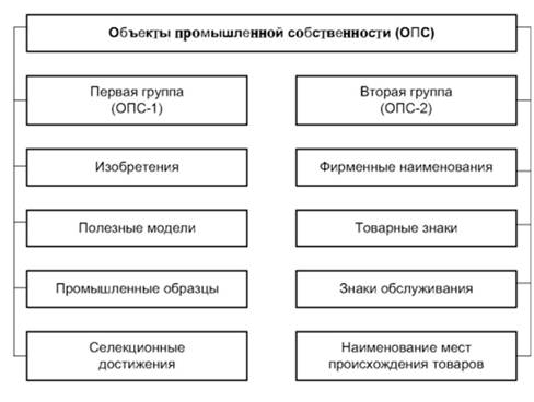 Рис. 6.2. Основные виды ноу-хау Как правило, информация по ноу-хау организации фиксируется в технической, коммерческой и руководящей (организационной) документации для внутреннего пользования организации. Эта информация является объектом промышленного шпионажа в условиях недобросовестной конкуренции. Как любой вид интеллектуальной собственности объекты ноу-хау являются интеллектуальными продуктами и имеют рыночную стоимость. Право пользования ноу-хау может продаваться вместе с оформлением лицензионного договора на производство патентованной продукции, о чем делаются указания в лицензии. В современных условиях бурного развития инновационной экономики, непрерывного совершенства производства, постоянного обновления выпускаемых товаров и услуг ноу-хау приобретают особое значение, обеспечивая успех в конкурентной борьбе и расширение рыночных ниш в организации. Значимость ОПС определяется существенными выгодами, которые получают организации, создающие или приобретающие в процессе инновационной деятельности объекты интеллектуальной собственности. Прежде всего, это преимущества в конкурентной борьбе: (1) монопольное право на производство данного типа продукции, которое получает фирма, владелец патента (свидетельства) или лицензии; (2) более успешное проникновение на новые рынки с новым товаром; (3) больший спрос на товар с известной у потребителей торговой маркой; (4) возможность продажи товара по более высокой цене при наличии существенной новизны или известности торговой марки; (5) уменьшение расходов на рекламу. Объекты промышленной собственности приносят их владельцам значительные финансовые выгоды за счет продажи прав на ОПС (продажа патентов и торговых марок) и заключения лицензионных договоров. Финансовые выгоды следуют также из возможностей снижения налогооблагаемой базы и экономии на НДС. Будучи хорошо оцениваемыми и реализуемыми на рынке интеллектуальной собственности нематериальными активами, каждый новый ОПС становится дополнительным вкладом в уставный капитал организации. Этот фактор предопределяет необходимость строгого учета ОПС, которыми владеет организация, и умения оценить их стоимость. Существующие и определенные законодательством Российской Федерации объекты промышленной собственности целесообразно учитывать, разделяя на две группы по их назначению (рис. 6.3).