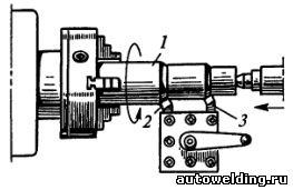 Хомутики служат для передачи вращения от шпинделя к обрабатываемой заготовке, установленной в центрах станка. Хомутик надевают на заготовку и закрепляют винтом, при этом хвостовик 2 хомутика упирается в палец поводкового патрона. При обработке заготовки в центрах передачу движения ей может осуществлять поводковый патрон через палец-поводок и хомутик, который крепится на детали винтом. Для сокращения вспомогательного времени при черновой обработке в центрах валов диаметром 15...90 мм применяют самозажимные поводковые патроны. Цанговые патроны применяют главным образом для закрепления холоднотянутого прутка или для повторного зажима заготовок по предварительно обработанной поверхности. Мембранные патроны применяют в том случае, когда необходимо обработать партию заготовок с высокой точностью центрирования. Способ установки и закрепления заготовок на станке выбирают в зависимости от их размеров, жесткости и требуемой точности обработки. При соотношении l/D < 4 (где l — длина обрабатываемой заготовки, мм; D — диаметр заготовки, мм) заготовки закрепляют в патроне, при 4 < l/D< 10 — в центрах или в патроне с поджимом задним центром (рис. 4.15), при l/D> 10 — в центрах или в патроне и центре задней бабки и с поддержкой люнетом (рис. 4.16).