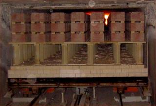 Процесс сушки кирпичей в специальной печи Управление процессом сушки производится в автоматическом режиме. В момент загрузки и разгрузки камер клапаны, которые регулируют поступление воздуха, закрываются и воздуходувки отключаются. В это время тележка и платформа производят разгрузку сушильных камер. Сухие изделия автоматически укладываются на печные вагонетки с помощью садчика и транспортируются в печь для обжига.
