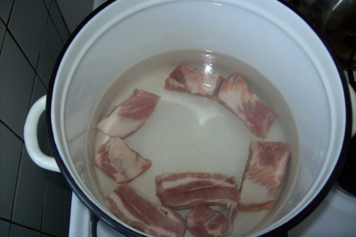 Далее нарезаем мясо. Как по мне, идеальным вариантом являются свиные ребрышки. Там есть и мясо и косточка. Приблизительно так.