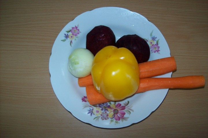 Начинаем заниматься заправкой. Вот, что нам понадобится. Лук, свекла, морковь и перец.