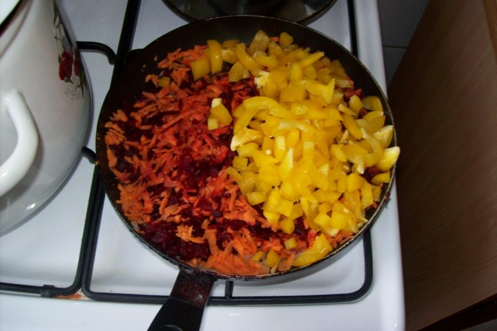 Перец и лук мелко порезали, морковку и свеклу потерли на крупной терке.