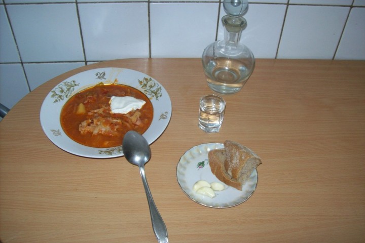 Далее постараюсь аргументировать сказанное выше. Итак, пятница. Так уж получилось, что я не попал сегодня на работу. И после двенадцати, я оказался совершенно свободным. И решил сварить борщ. Мы никуда не торопимся. Впереди целых два дня выходных! Наконец можно будет выспаться. Сходил, не спеша, купил все необходимое и... Дальше я буду писать преимущественно для мужчин. Мне кажется, что борщ должен варить все-таки мужчина. Нет, конечно мои бабушки варили замечательные борщи... И все же... С чего начать? С самого главного! Берем графинчик, наливаем туда 150 грамм водочки (из расчета на одну тарелку борща) и ставим это дело в холодильник. Дальше сцепив зубы забываем о графинчике и содержимом на два часа. Приблизительно столько варится борщ. Этого времени хватит, чтобы водочка охладилась до нужной температуры и графинчик покрылся нежными прозрачными капельками росы.