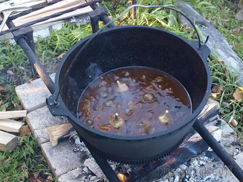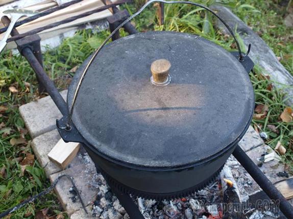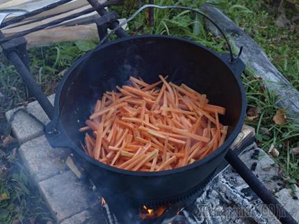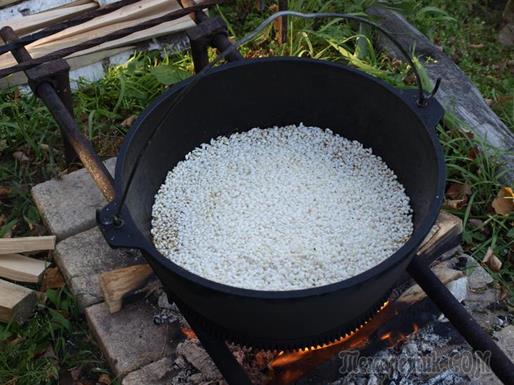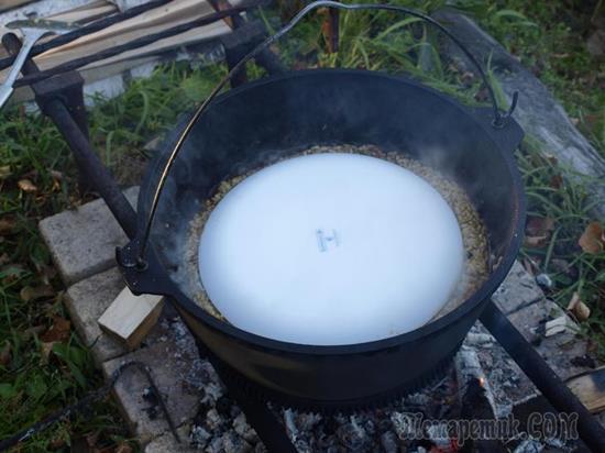Разводим огонь и ставим на максимальный огонь казан. Заливаем в казан кипяток, ополаскиваем внутри казан кипятком и сливаем воду. Казан опять ставим на огонь (огонь постоянно поддерживать максимальным), даем просохнуть и заливаем масло (или же закладываем порезанный кубиками курдючный жир и вытапливаем его, до образования «шкварок», которые затем вылавливаем шумовкой). Масло разогревается до появления легкого дымка (пять - семь минут),