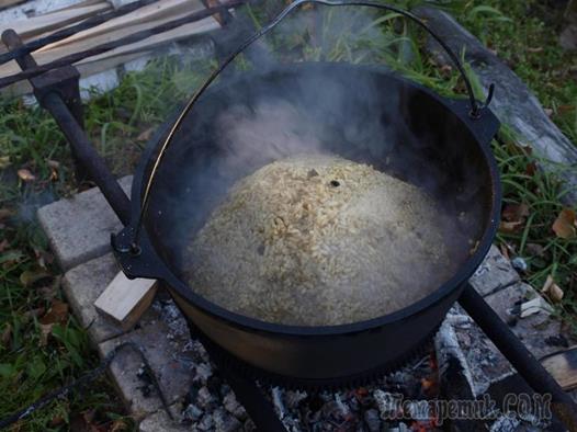 Снимаем казан с огня и оставляем его еще минут на десять-пятнадцать не снимая крышки. Перемешиваем готовый плов в казане