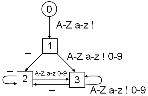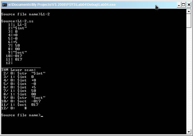 Лабораторная работа № 3-4 Студент: Тафинцев Г.М. Группа: 8О-208Б Номер по списку: 14 Вариант: 34 Дата: 13.04.2015 Тема: Лексический анализ. ……………………………………………………………………………………………………………………………………. Краткая формулировка задания В тренажере Lexer.h дополнить конструктор класса tLexer определениями автоматов, распознающих все токены языка МИКРОЛИСП. Шаблоны токенов взять из лабораторной работы №3. В отчет включить диаграммы автоматов только для токенов $float, $id и $idq, выполненные в ГРАФИЧЕСКОМ РЕДАКТОРЕ, и протоколы тестирования(screenshot). ……………………………………………………………………………………………………………………………………. Набор отчетных документов Лабораторная работа №4 Lexer.h 2015 Ifndef LEXER_H Define LEXER_H #include " baselexer.h" //******************************************** //* Developed by THM * //* (c) 2015 * //******************************************** class tLexer: public tBaseLexer{ public: Персональный код разработчика std:: string Authentication()const{ return " THM"; } Конструктор tLexer(): tBaseLexer(){ //создать автоматы: Целое addstr (Aint, 0, " +-", 2); addstr (Aint, 0, " 0", 1); addstr (Aint, 1, " 0", 1); addstr (Aint, 2, " 0", 1); addrange(Aint, 0, '1', '9', 3); addrange(Aint, 2, '1', '9', 3); addrange(Aint, 3, '0', '9', 3); Aint.final(1); Aint.final(3); //________________________________________ Восьмеричное Aoct addstr (Aoct, 0, " +-", 3); addstr (Aoct, 0, " 0", 1); addstr (Aoct, 1, " 0", 1); addstr (Aoct, 3, " 0", 1); addrange(Aoct, 1, '1', '9', 2); addrange(Aoct, 2, '0', '9', 2); Aoct.final(2); //________________________________________ Вещественное Afloat addstr (Afloat, 0, " +-", 1); addstr (Afloat, 2, ".", 3); addstr (Afloat, 4, " Ee", 5); addstr (Afloat, 5, " +-", 6); addrange(Afloat, 0, '0', '9', 2); addrange(Afloat, 1, '0', '9', 2); addrange(Afloat, 2, '0', '9', 2); addrange(Afloat, 3, '0', '9', 4); addrange(Afloat, 4, '0', '9', 4); addrange(Afloat, 6, '0', '9', 7); addrange(Afloat, 7, '0', '9', 7); Afloat.final(3); Afloat.final(7); //________________________________________ Идентификатор Aid addstr (Aid, 0, "! ", 1); addrange(Aid, 0, 'A', 'Z', 1); addrange(Aid, 0, 'a', 'z', 1); addstr (Aid, 1, " -", 2); addstr (Aid, 1, "! ", 3); addrange(Aid, 1, 'A', 'Z', 3); addrange(Aid, 1, 'a', 'z', 3); addrange(Aid, 1, '0', '9', 3); addstr (Aid, 2, " -", 2); addrange(Aid, 2, 'A', 'Z', 3); addrange(Aid, 2, 'a', 'z', 3); addrange(Aid, 2, '0', '9', 3); addstr (Aid, 3, " -", 3); addstr (Aid, 3, "! ", 2); addrange(Aid, 3, 'A', 'Z', 2); addrange(Aid, 3, 'a', 'z', 2); addrange(Aid, 3, '0', '9', 2); Aid.final(1); Aid.final(2); Aid.final(3); //________________________________________ Идентификатор предиката Aidq addstr (Aidq, 0, "? ", 2); addrange(Aidq, 0, 'A', 'Z', 1); addrange(Aidq, 0, 'a', 'z', 1); addrange(Aidq, 1, 'A', 'Z', 1); addrange(Aidq, 1, 'a', 'z', 1); addrange(Aidq, 1, '0', '9', 1); addstr (Aidq, 1, " -", 1); addstr (Aidq, 1, "? ", 2); addrange(Aidq, 2, 'A', 'Z', 1); addrange(Aidq, 2, 'a', 'z', 1); addrange(Aidq, 2, '0', '9', 1); addstr (Aidq, 2, " -", 1); Aidq.final(2); //________________________________________ Оператор Aoper addstr(Aoper, 0, " +-=*/", 1); addstr(Aoper, 0, " < > ", 2); addstr(Aoper, 2, " =", 1); Aoper.final(1); //________________________________________ Булевские константы Abool addstr(Abool, 0, " #", 1); addstr(Abool, 1, " tf", 2); Abool.final(2); //________________________________________ Строка // ФАКУЛЬТАТИВНОЕ ЗАДАНИЕ* // дополнить esc-последовательностями \" и \\ Тест L8.ss addstr (Astr, 0, " \" ", 1); addstr (Astr, 1, " \" ", 2); addrange(Astr, 1, ' ', '" '-1, 1); addrange(Astr, 1, '" '+1, '~', 1); addrange(Astr, 1, -128, -1, 1); Astr.final(2); //________________________________________ } }; Endif Вывод программы:
