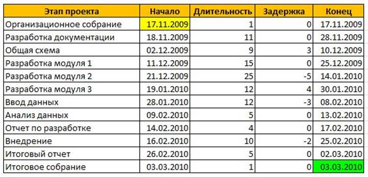 Даты начала и окончания этапов могут вводиться вручную, а могут и вычисляться с помощью простых формул.