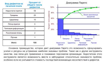 Диаграмма Парето СЛ 19 Диаграмма Парето является особым типом гистограммы, упорядоченной по частоте возникновения. Она показывает, какое количество обнаруженных дефектов является следствием причин, относящихся к определенному типу или категории (рис. 8-15). Порядок ранжирования элементов в диаграмме Парето используется для принятия решений о проведении корректирующих воздействий. Команда проекта должна в первую очередь принимать решения по тем проблемам, которые являются причиной наибольшего количества дефектов. Диаграмма Парето - это столбчатая диаграмма, на которой интервалы (столбики) упорядочены по нисходящей линии. На такой диаграмме интервалы могут представлять виды дефектов, их локализацию, ошибки и пр. А высота интервалов (высота столбиков) - частоту возникновения дефектов, их процентное соотношение, стоимость, время и пр. Диаграмма Парето является графическим отображением правила Парето. В менеджменте качества применение этого правила показывает, что значительное число несоответствий и дефектов возникает из-за ограниченного числа причин. Коротко правило Парето формулируется как 80 на 20. Например, если применить это правило по отношению к дефектам, то окажется, что 80 процентов дефектов возникает из-за 20 процентов причин. Используется диаграмма Парето при выявлении наиболее значимых и существенных факторов, влияющих на возникновение несоответствий или брака. Это дает возможность установить приоритет действиям, необходимым для решения проблемы. Кроме того, диаграмма Парето и правило Парето позволяют отделить важные факторы от малозначимых и несущественных. Строится диаграмма Парето в следующем порядке: 1. Определяется проблема, которую необходимо решить (например, дефектные изделия, стоимость потерь от брака и т.п.) и выбирается временной интервал для изучения проблемы. 2. Выбирается тип данных (фактор) для анализа, который наиболее полно сможет охарактеризовать проблему (например, дефекты, их локализация, объем потерь, затраты и пр.). Выбранный тип данных должен быть разбит на подтипы. Например, если в качестве типа данных выбраны дефекты, то подтипом будут являться виды дефектов – деформация, царапины, трещины и пр. 3. Определяется единица измерений, соответствующая типу данных (например, количество дефектов, их частота, процент затрат и т.п.). 4. Собираются статистические данные, и выполняется их систематизация. Для сбора и регистрации данных можно применять другие инструменты качества, например контрольный листок. Систематизацию статистических данных лучше представить в виде таблицы. 5. Выполняется подсчет и упорядочивание данных по убыванию. 6. При необходимости назначаются веса для каждого из подтипов данных. Установление весов может оказать существенное влияние на результат, который покажет диаграмма Парето. Веса перемножаются на подсчитанные значения по каждому из подтипов данных, что приводит к изменению соотношения их значимости. 7. Строится столбчатая диаграмма, на которой отмечаются подтипы данных и их величина. В прямоугольной системе координат по горизонтали откладываются равные отрезки, соответствующие подтипам данных, а по вертикали отмечается величина этих данных в порядке по убыванию. 8. Вычисляется и отображается на диаграмме линия суммарных значений (например, накопленных процентов)