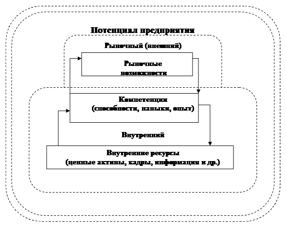 Одной из главных задач руководства предприятия является формирование и оценка текущих и перспективных возможностей предприятия, т.е. формирование и оценка его потенциала. Это вызвано, прежде всего, необходимостью обеспечения эффективности функционирования и укрепления конкурентоспособности на рынке. Термин «Потенциал» от латинского “potential” означает «мощность, сила». В соответствии с определением Большого экономического словаря «потенциал как экономическая категория» представляет имеющиеся возможности, ресурсы, запасы, средства, которые могут быть использованы для достижения, осуществления чего-либо. Основная масса публикаций по теории потенциалов посвящена такой категории как экономический потенциал предприятия. Самоукин Л.И. считает, что экономический потенциал необходимо рассматривать во взаимосвязи со свойствами каждой экономической фармации производственными отношениями, возникающими между отдельными работниками, трудовыми коллективами, а также управленческим аппаратом предприятия по поводу полного использования их способностей по созданию материальных благ и услуг. Марушков Р.В. в своем диссертационном исследовании трактует экономический потенциал как «… способность предприятия обеспечивать свое долгосрочное функционирование и достижение стратегических целей на основании использования системы явных ресурсов». Исходя из того, что в процессе изучения экономических дисциплин предприятие рассматривается как открытая экономическая система, то с гносеологической точки зрения категорию «экономический потенциал предприятия» возможно, рассматривать как тождественную категории «потенциал предприятия». Наиболее распространенна трактовка сущности потенциала предприятия как совокупности природных условий и ресурсов, возможностей, запасов и ценностей, которые могут быть использованы для достижения определенных целей. Таким образом, практически все определения той или иной степенью опираются на ресурсы предприятия, на способность предприятия мобилизовать их в процессе осуществления бизнес-процессов. С учетом того, что совокупность таких способностей в экономической литературе принято называть компетенциями, то потенциал предприятия можно определить как возможности системы ресурсов и компетенций предприятия создавать результат для заинтересованных лиц при помощи реализации бизнес-процессов. Учитывая содержание приведенного определения, а также то, что компетенции и ресурсы, предопределяя внутренние возможности предприятия, должны обеспечивать и его конкурентные преимущества в рыночной среде, определяя возможности спроса, то модель потенциала предприятия может иметь следующее графическое изображение: