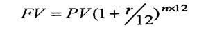 Таким образом, использование данной функции предусматривает начисление процентов не только на сумму первичного взноса, но и на сумму процентов, которые накапливаются в конце каждого периода. Это возможно только при условиях реинвестирования начисленных процентов, которое увеличивает сумму основного капитала. При условии более короткого периода накопления (месяц) формула определения будущей стоимости следующая:
