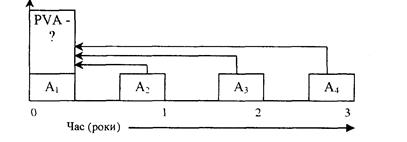 Поскольку аннуитет представляет собой особый денежный поток, представленный одинаковыми сумами через одинаковые временные интервалы, то относительно инвестора он может быть как исходным (например, осуществление периодических одинаковых платежей), так и входным денежным потоком (например, регулярные поступления фиксированных сумм арендной платы). Кроме того, в зависимости от момента осуществления первого аннуитетного платежа различают обычный и авансовый аннуитет. Обычный аннуитет определяется как сумма равновеликих платежей, которые осуществляются в конце периода. Авансовый аннуитет имеет место при условиях временного совпадения первого платежа с депонированием основной суммы взноса. Графическая интерпретация текущей стоимости обычного аннуитета приведена на рис.3: