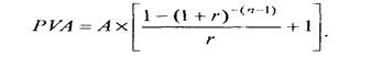 Для того чтобы рассчитать текущую стоимость авансового аннуитета, необходимо исследовать движение денежного потока. Поскольку первый платеж совпадает по времени с депонированием основной суммы взноса, то его будущая стоимость равняется настоящей и не нуждается в дисконтировании для обеспечения сравнимости. Все следующие аннуттетные платежи дисконтируются в обычном порядке, тем не менее, период дисконтирования всегда будет на единицу меньше. Поэтому фактор текущей стоимости авансового аннуитета равен фактору текущей стоимости обычного аннуитета для предыдущего периода, увеличенному на единицу.