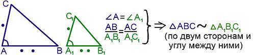 II. Признак подобия треугольников по двум сторонам и углу между ними. Если две стороны одного треугольника пропорциональны двум сторонам другого треугольника и углы, образованные этими сторонами, равны, то треугольники подобны.