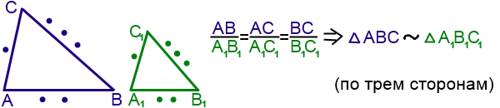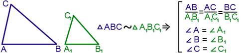 III. Признак подобия треугольников по трем сторонам. Если стороны одного треугольника пропорциональны сторонам другого треугольника, то такие треугольники подобны.