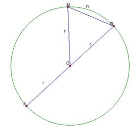 Рис. 1. Иллюстрация к примеру В данном случае фигура является окружностью, так как это все множество точек, равноудаленных от центра. Если соединить любые две точки окружности – получаем хорду. Хорда, проходящая через центр, называется диаметром. MB – хорда; АВ – диаметр; MnB – дуга, она стягивается хордой МВ; Угол Точка О – центр окружности.