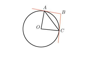 Проведем радиус Получается, что угол между касательной и хордой, проведенной через точку касания, равен половине угловой величины дуги, заключенной между ними.