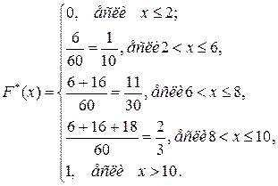 Решение. Объем выборки n = 6+16+18+20 = 60. Составим функцию, используя формулу F*(x).