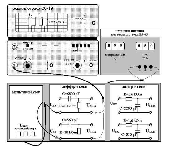 Подготовка установки к работе. Включите в сеть осциллограф иисточник питания постоянного тока. Установите на источнике питания выходное напряжение 9, 5В и ток 50mA. Чувствительность осциллографа установите 2 В/дел, а время развертки – 10 mc. Напряжение от источника питания используется для работы мультивибратора. Внешний вид установки приведен на рис.1.
