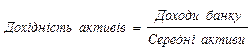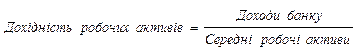 Прибутковість активів розраховується за такою формулою: ROA1 = Чистий прибуток / середні загальні активи. Цей показник може використовуватись як коефіцієнт для оцінки діяльності керівництва банку. Але у зв’язку з тим, що не всі активи дають дохід, деякі банки в процесі аналізу прибутковості своєї діяльності деталізують показник процента прибутковості активів і розраховують процент прибутковості робочих активів: ROA2 = Чистий прибуток / Робочі активи. Зіставлення показників ROA1 та ROA2 дає можливість виявити невикористані резерви підвищення прибутковості активів за рахунок поліпшення їх структури, ефективнішого використання. Зіставлення цих коефіцієнтів дає уявлення про можливості зростання рентабельності завдяки скороченню активів, які не приносять доходу. Передусім це стосується іммобілізованих власних коштів. Для банки, які використовують як кредитні ресурси залучені кошти, абсолютна рівність між цими показниками не можлива. Адже банки повинні створювати обов’язкові резерви, тобто зберігати частину залучених коштів у найбільш ліквідній формі, яка не дає доходу. На практиці вважається: якщо рівень прибутковості активів перевищує 1%, то банк працює рентабельно. Для оцінки ефективності видатків банку використовується показник рівня їх прибутковості (Rв), який розраховується за такою формулою: Rв = Прибуток банку / Витрати банку. Прибутковість (рентабельність) доходу розраховується у такий спосіб: Rд = Прибуток до оподаткування / Доходи банку, всього. Оптимальне значення цього показника 7 – 8%. Він відображає кількість грошових одиниць, які припадають на одну грошову одиницю доходу, або частку прибутку в доході. Його значення зменшується у разі зростанні витрат. Показник прибутковості доходу відбиває здатність менеджменту банку контролювати свої витрати. Зростання цього показника свідчить про гармонізацію структури ресурсної бази, тобто зменшення, наскільки це можливо, частки дорогих інструментів. Ефективність операційної діяльності комерційного банку можна оцінити за допомогою показника чистого спреду, який розраховується за такою формулою: