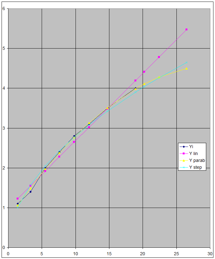 Таким образом, наименьшая ошибка параболического уравнения регрессии (0, 051) при максимальном значении h, значит для прогнозирования данных (апроксимации или экстраполяции) будет использовано уравнение вида : y= 0, 716 + 0, 249*x - 0, 004*x^2. Нанесем на график эмпирическую линию и три наиболее близких линии регрессии (линейная, параболическая, степенная).