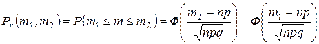 Вероятность того, что событие 2. Интегральная теорема Лапласа (Муавра-Лапласа). Если число независимых опытов n велико (несколько сотен), то вероятность появления события где Из интегральной теоремы Муавра-Лапласа следует, что вероятность того, что относительная частота Примечание. Формула Бернулли, локальная теорема Муавра-Лапласа и формула закона Пуассона дают ответ на один и тот же вопрос, а именно, они определяют вероятность того, что в n независимых испытаниях некоторое событие наступит ровно m раз, если в каждом испытании это событие может наступить с постоянной вероятностью р. По формуле Бернулли получаем точное значение вероятности этого события. Однако из-за вычислительных трудностей эта формула применяется только в случаях, когда число испытаний n невелико. Если число испытаний будет большим, то используется локальная теорема Муавра-Лапласа, а если, кроме того, вероятность поступления события в отдельном испытании мала, то - формула Пуассона