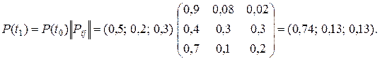 Искомые вероятности получаются умножением вектора вероятностей состояния цепи Маркова на переходную матрицу вероятностей. Получаем: