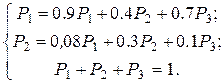 Таким образом, через месяц наибольшим спросом будет пользоваться изделие Определим, какое изделие будет пользоваться наибольшим спросом по истечении достаточно продолжительного периода. Все элементы матрицы перехода положительны, следовательно, предельные вероятности Система уравнений в данном случае имеет вид