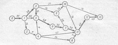 а для критического пути t (L1i) + t (L2i) = t (Lкр) (4) Следовательно, для событий, принадлежащих критическому пути, Tpi = Тпi. Иными словами, события критического пути имеют нулевой резерв времени, т.е. для этих событий наибольший допустимый срок равен наименьшему ожидаемому. Путь, соединяющий эти события, соответствует максимальной продолжительности последовательных работ, ведущих от исходного к завершающему событию. Исходное и завершающее события во всех случаях имеют нулевой резерв времени. Таким образом, наиболее простой способ выявления критического пути — это определение всех последовательно расположенных событий, имеющих нулевой резерв времени. Такой способ наиболее эффективно использовать при автоматизации расчетов. Для некоторых разработок устанавливается директивный срок свершения завершающего события, который может быть меньше рассчитанного по сетевому графику на основании оценок, данных ответственными исполнителями. В последнем случае некоторые события могут иметь отрицательные резервы времени. Критический путь будет проходить через события с наибольшими по абсолютной величине отрицательными резервами. Этот случай далее не рассматривается, так как находится в противоречии с одной из основных предпосылок СПУ, заключающейся в том, что оно основано на планировании снизу, а не на установлении волевых сроков сверху. Расчет ранних и поздних сроков свершения событий рассмотрен на примере сетевого графика, изображенного на рис.1. Результаты расчета сведены в табл.1. Расчет начинается с первой работы 0-1. Чтобы перейти от события 0 к событию 1, следует ко времени свершения события 0 (которое в данном случае равно нулю) прибавить 21 день, потребный для выполнения работы, приводящей к событию 1. Других путей между событиями 0 и 1 нет, поэтому значение 21 заносится в графу Tpj (табл.1). Таблица 1