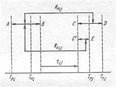 Графически полный резерв может быть представлен как сумма двух отрезков АВ + CD. Каждый из этих отрезков охватывает величину резерва времени соответствующего события Ri и Rj и величину возможного смещения начала или окончания работы. Эти последние величины зависят, естественно, от продолжительности самой работы. Свободный резерв — это резерв собственно работы i-j при условии свершения предшествующего и последующего событий в их ранние сроки. Свободный резерв определяется суммой отрезков АВ и C'F. Действительно, как указывалось, аналитическое выражение свободного резерва определяется выражением Tpj — Tpi— tij. Изображенные на рис.2 отрезки соответствуют величине этого выражения. Ответственные исполнители, располагая графиками, характеризующими резервы закрепленных за ними работ, могут представить возможности маневрирования ресурсами времени.