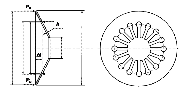 Диафрагменная (тарельчатая) пружина (Рис. 21) используемая в автомобильном сцеплении имеет две части. Одна - с радиальными разрезами служит для выключения (отвода нажимного диска), другая – рабочая, сплошного сечения находится между опорами и наружным диаметром. Опоры встроены в закругления на концах разрезов и закрепляют пружину к кожуху. Наружным диаметром пружина давит на нажимной диск, создавая силу Рн (см. формулу (37) и рис. 21). Размеры D, d, d 1 (Рис. 21) выбираются конструктивно в соответствии с диаметром нажимного диска и выжимного подшипника. Для упрощения расчетов можно принять: D 0 = 0, 98· D и d 0 = 1, 01· d. Толщина пружины h определяется по формуле: