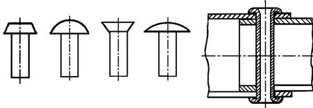 Рис. 5.5. Виды соединений Для образования замыкающих головок заклепок применяют в основном прессование, которое обеспечивает большую прочность и однородность соединения при значительно меньшей трудоемкости по сравнению с ударной клепкой. В тех случаях, когда прессование применять нельзя, используют ручную клепку пневматическим инструментом, а для трубчатых заклепок – раскатывание. Замыкающую головку по возможности располагают со стороны более прочной детали.