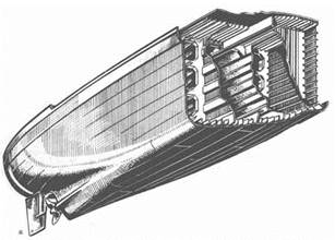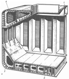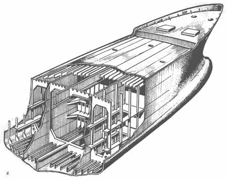 Система продольного набора: а — танкер (система Ишервуда); b — контейнеровоз. При комбинированной продольно-поперечной системе набора днищевая обшивка подкреплена стрингерами, палуба (прочная)—продольными подпалубными балками, а бортовая наружная обшивка - шпангоутами с нормальным расстоянием друг от друга. Принято применять продольную систему набора только в прочной палубе или в днище. Комбинированную систему набора применяют обычно на грузовых и пассажирских судах длиной более 130 м, а также на грузовых судах для массовых грузов (рис. а, b); на танкерах она применяется как система Миллара (рис. с) для судов длиной от 80 примерно до 180 м