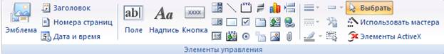 Рисунок 4 - Расположение разделов проекта формы в окне конструктора формы Заголовок формы содержит сведения, общие для всех записей, такие как название формы, дата и время. Примечание формы отображает сведения, общие для всех записей, такие как инструкции по работе с формой, командные кнопки, общие суммы в счетах. Верхний колонтитул и Нижний колонтитул используются в случае конструирования формы табличного вида. Тогда в Верхнем колонтитуле отображаются названия столбцов, а в Нижнем колонтитуле – номер страницы, дата. Изменение высоты и ширины раздела производится путем перетаскивания соответственно нижней и правой границы раздела. Элементы управления и работа с ними Разделы проекта формы наполняются различными графическими объектами - элементами управления, используемыми для отображения данных, выполнения действий или в качестве украшений. Элементы управления вводятся в форму при помощи графических кнопок панели элементов, изображенной на рис. 5.